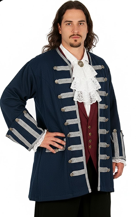 A commanding coat with decorative braid closures, structured cuffs, and a tailored long silhouette inspired by classic 18th-century naval style..